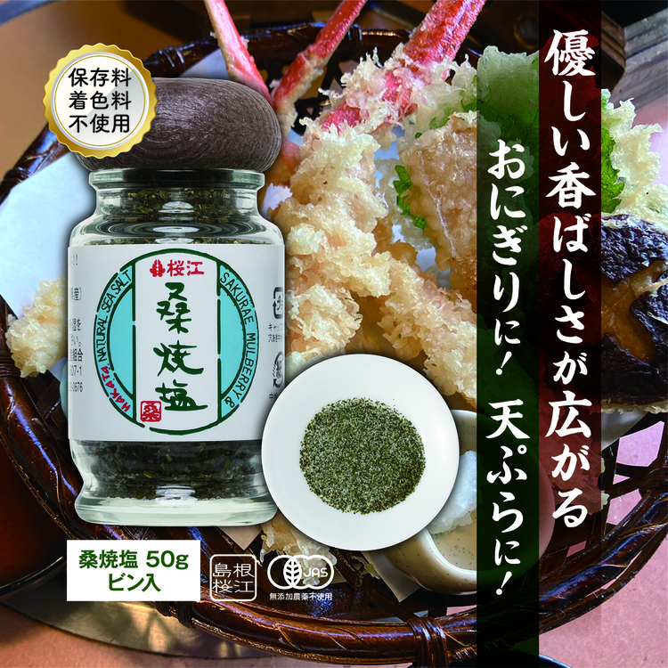 品名 桑焼塩/原材料名 焼塩(国内製造)、桑葉/内容量 50g/賞味期限 製造日から2年/保存方法 直射日光、高温多湿を避けて保存してください。 【カタログ番号】46 ※しまね有機ファームグループ