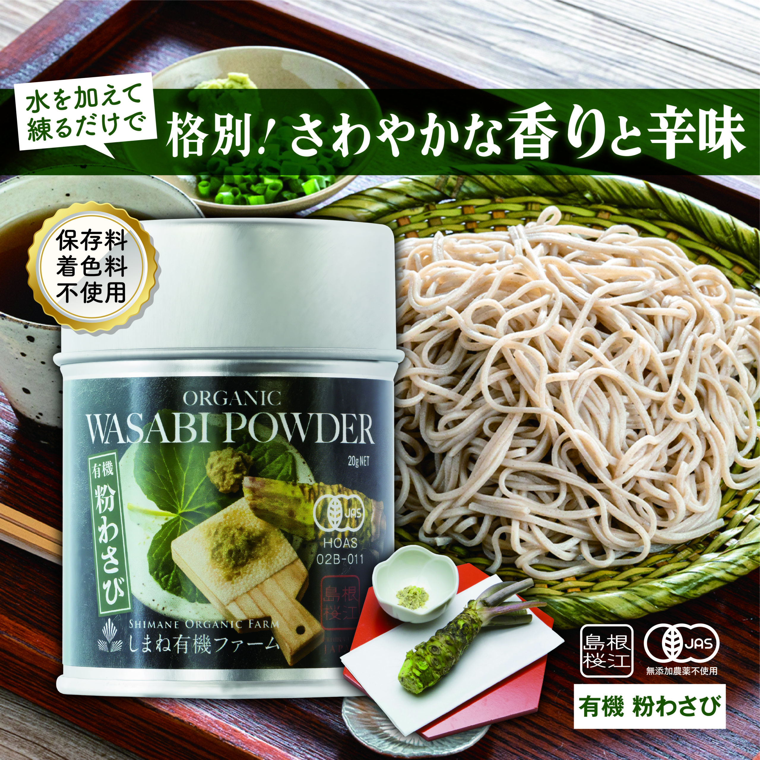 名称 有機粉わさび/原材料名 有機西洋わさび(島根県産)、有機本わさび(島根県産)/内容量 20g/賞味期限 製造日より1年半/保存方法 高温多湿、直射日光を避けて保存してください。 ※しまね有機ファームグループ