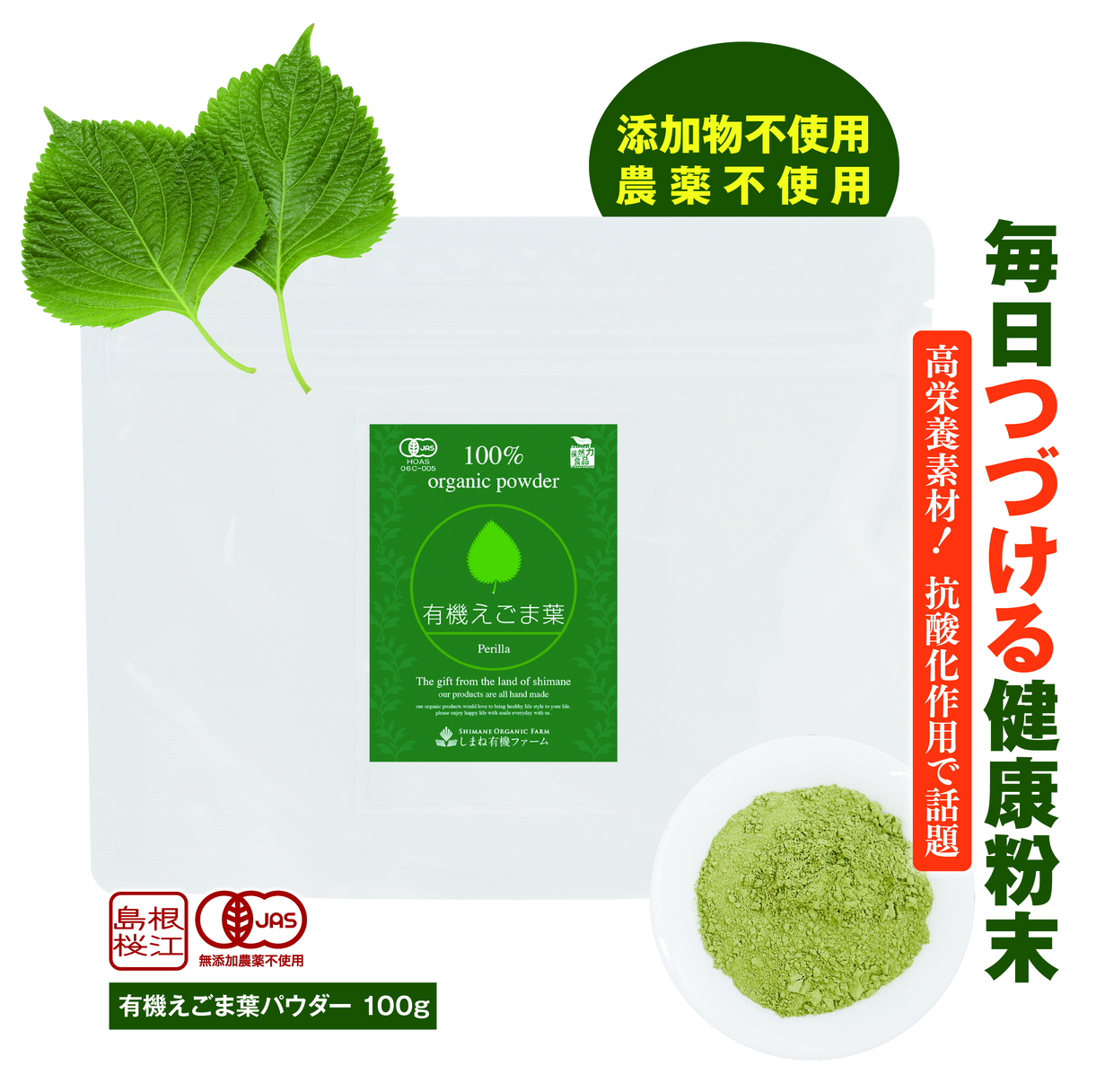 名称 有機えごま葉粉末/原材料名 有機えごま(島根県産)/内容量 100g/賞味期限 製造日から1年半/【カタログ番号】94 ※しまね有機ファームグループ