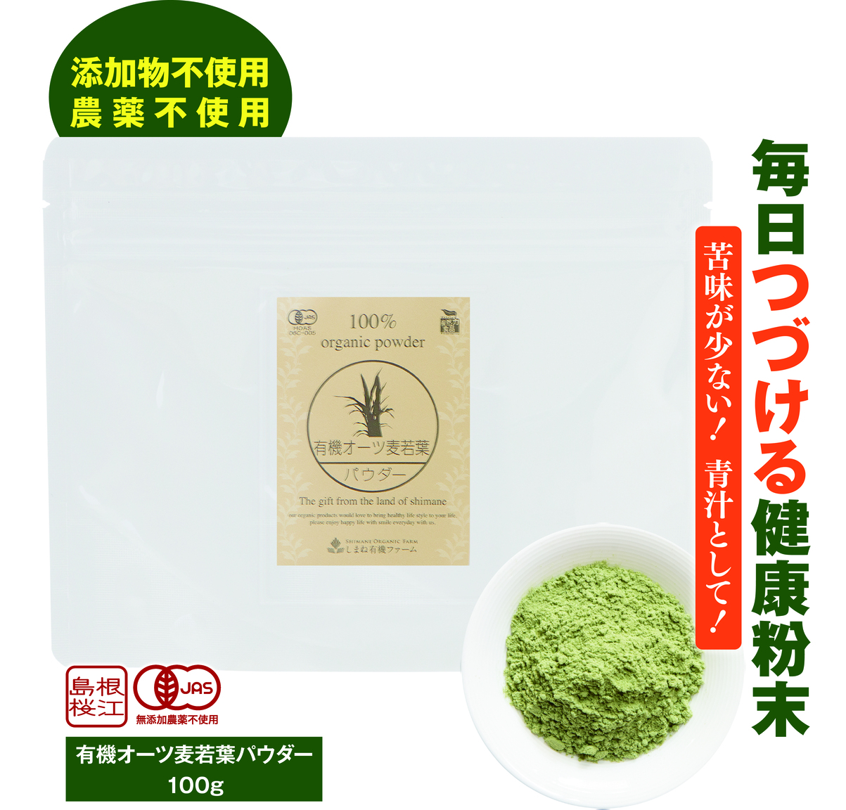 名称 有機オーツ麦若葉粉末/原材料名 有機オーツ麦若葉(島根県産)/内容量 100g/賞味期限 製造日から1年半/【カタログ番号】95 ※しまね有機ファームグループ